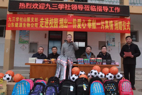 人生之善莫過(guò)于助人,助人之德莫過(guò)于助學(xué),為積極履行社會(huì)責(zé)任,關(guān)注支持貧困地區(qū)教育事業(yè)發(fā)展,2019年1月11日,九三學(xué)社與山東健源生物科技有限公司共同為泰安市高新區(qū)化馬灣鄉(xiāng)當(dāng)?shù)匾患倚W(xué)捐贈(zèng)了一批體育器材、學(xué)習(xí)用品及辦公用品,為該校師生送去了社會(huì)的關(guān)心和溫暖。