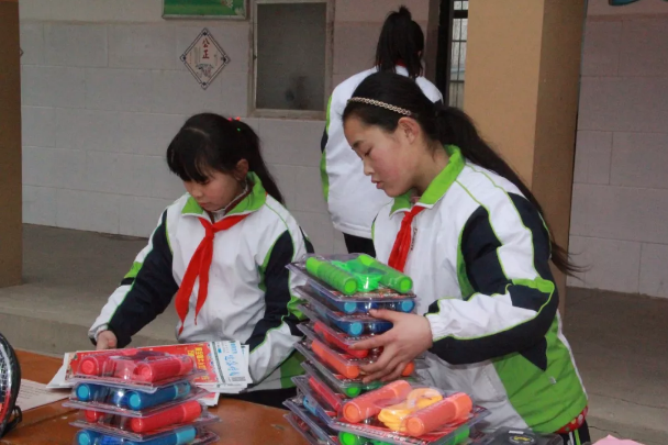 【為同學(xué)們分發(fā)學(xué)習(xí)用品】: