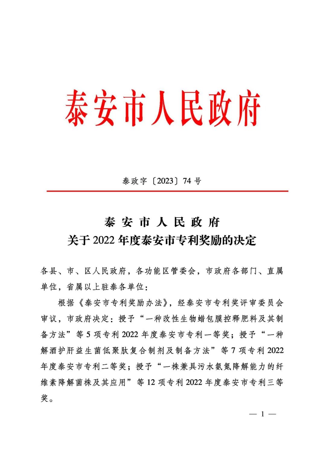2022年度泰安市專利獎(jiǎng)