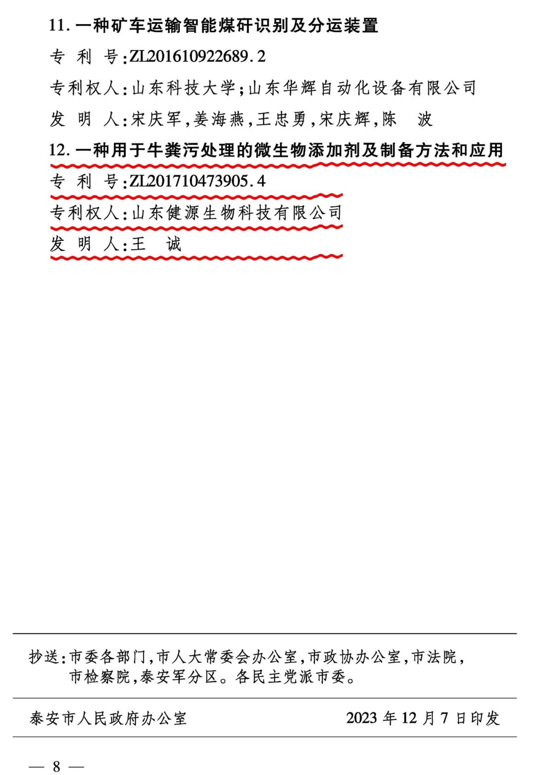 12月7日,泰安市人民政府發(fā)布關(guān)于2022年度泰安市專利獎(jiǎng)勵(lì)的決定(泰政字【2023】74號),山東健源生物科技有限公司的“一種用于牛糞污處理的微生物添加劑及制備方法和應(yīng)用”獲全市專利三等獎(jiǎng)。