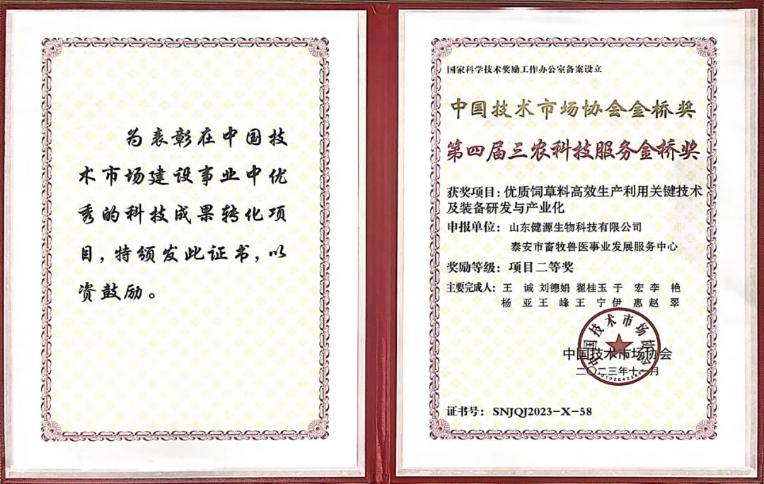 山東健源生物科技有限公司《優(yōu)質(zhì)飼草料高效生產(chǎn)利用關(guān)鍵技術(shù)及裝備研發(fā)與產(chǎn)業(yè)化》項(xiàng)目榮獲中國(guó)技術(shù)市場(chǎng)協(xié)會(huì)金橋獎(jiǎng)第四屆三農(nóng)科技服務(wù)獎(jiǎng)項(xiàng)目二等獎(jiǎng)。