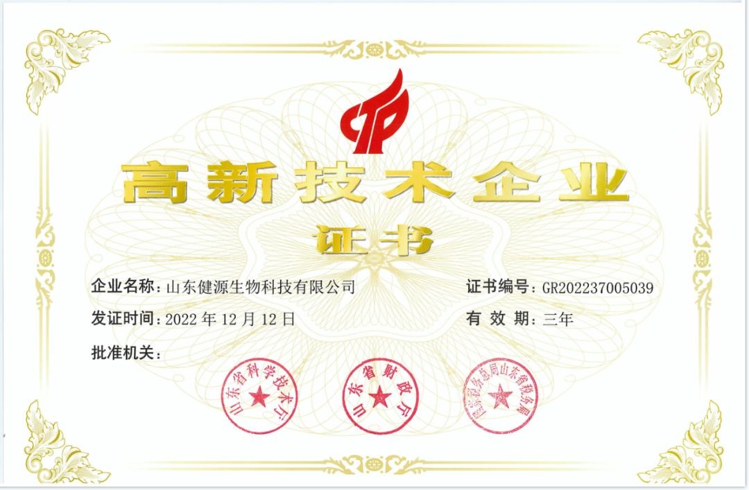 2022年12月,山東健源生物科技有限公司再次通過2022年度國家高新技術企業(yè)認定,有效期三年。