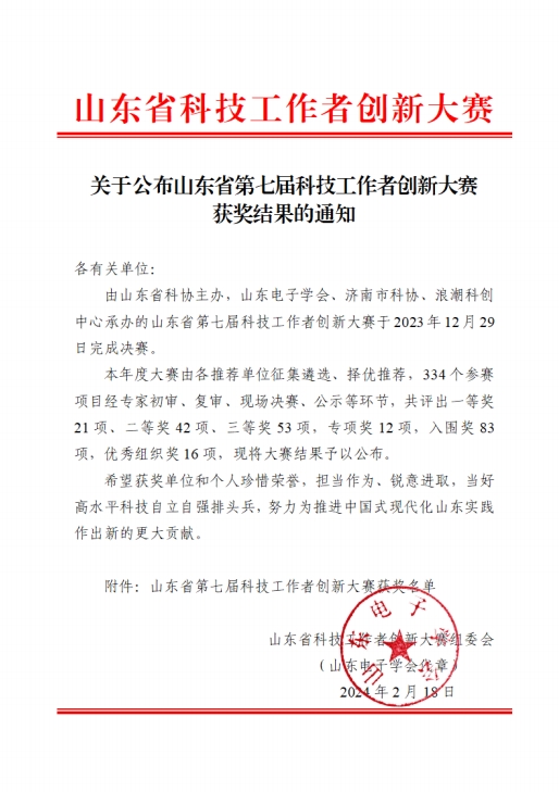 由山東省科協(xié)主辦,山東電子學(xué)會(huì)、濟(jì)南市科協(xié)、浪潮科創(chuàng)中心承辦的山東省第七屆科技工作者創(chuàng)新大賽于2023年12月29日完成決賽。本年度大賽由各市科協(xié)、省級(jí)學(xué)會(huì)、高校科協(xié)、院士工作站等征集遴選、擇優(yōu)推薦的334項(xiàng)參賽項(xiàng)目,經(jīng)專家初審、復(fù)審、現(xiàn)場(chǎng)決賽、公示等環(huán)節(jié),共評(píng)出一等獎(jiǎng)21項(xiàng),二等獎(jiǎng)42項(xiàng),三等獎(jiǎng)53項(xiàng),專項(xiàng)獎(jiǎng)12項(xiàng),入圍獎(jiǎng)83項(xiàng),優(yōu)秀組織獎(jiǎng)16項(xiàng)。