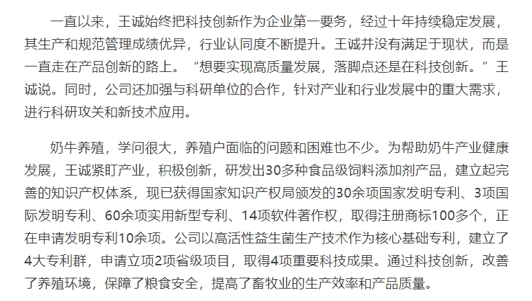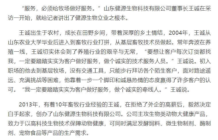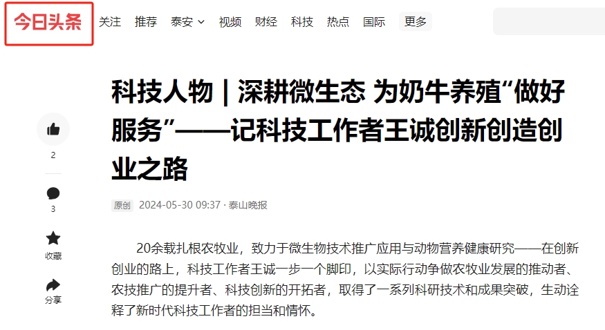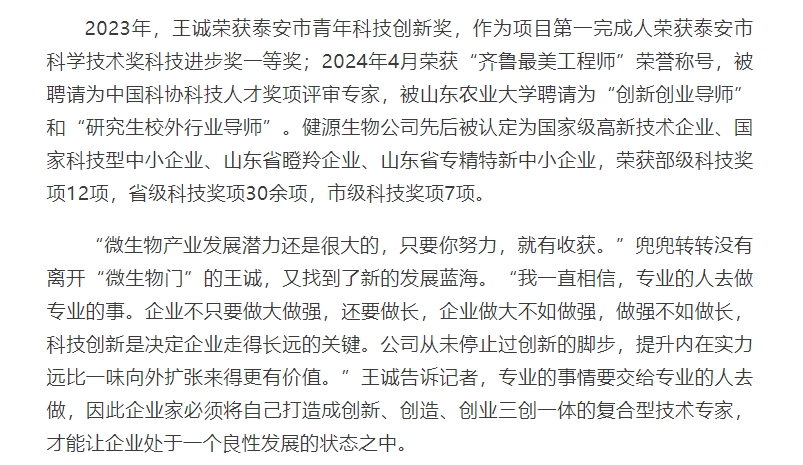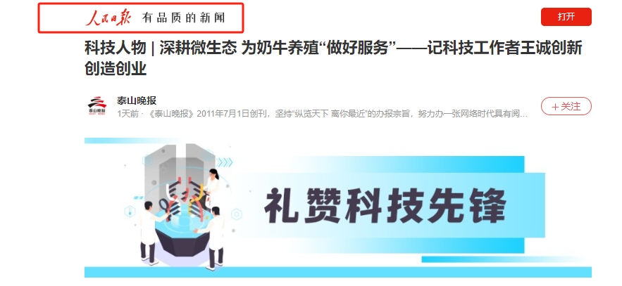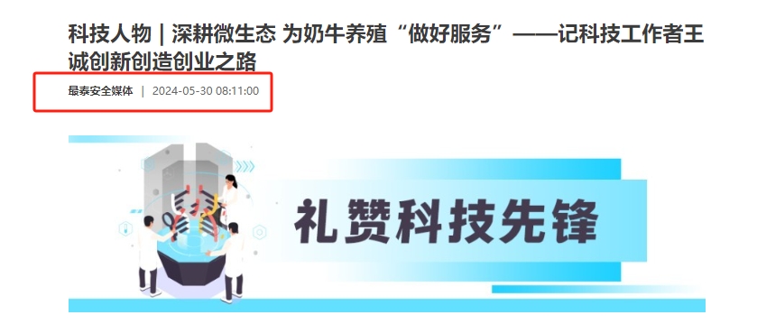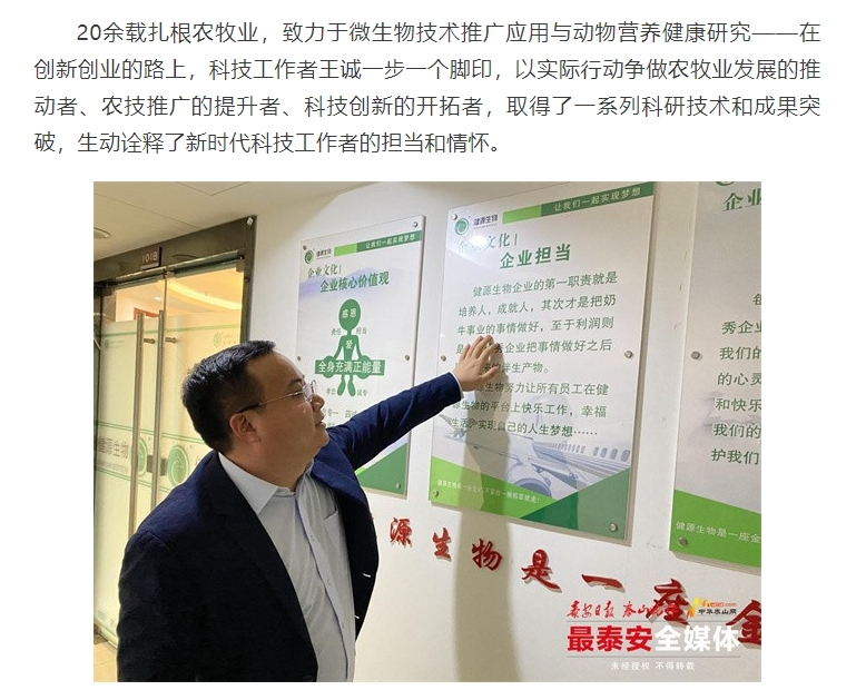 2024年5月30日迎來了第八個(gè)全國科技工作者日,山東健源生物科技有限公司董事長王誠作為泰安市科協(xié)推選的科技工作者代表接受了泰安日?qǐng)?bào)記者的采訪。《深耕微生態(tài),為奶牛養(yǎng)殖“做好服務(wù)”——記科技工作者王誠創(chuàng)新創(chuàng)造創(chuàng)業(yè)之路》報(bào)道在人民日?qǐng)?bào)、人民號(hào)、今日頭條、泰山晚報(bào)、最泰安全媒體等多家新聞平臺(tái)發(fā)布。
