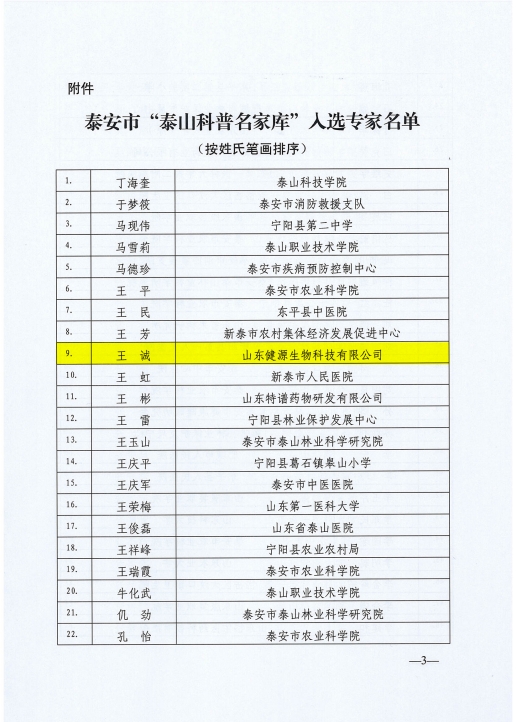 發(fā)布時間:[2024-6-6 16:33:30] 瀏覽量:2811次近日,泰安市科學(xué)技術(shù)協(xié)會公布了泰安市“泰山科普名家?guī)臁比脒x專家名單,根據(jù)泰安市“泰山科普名家?guī)臁比霂鞓?biāo)準(zhǔn),山東健源生物科技有限公司董事長王誠被認定為泰安市“泰山科普名家”。