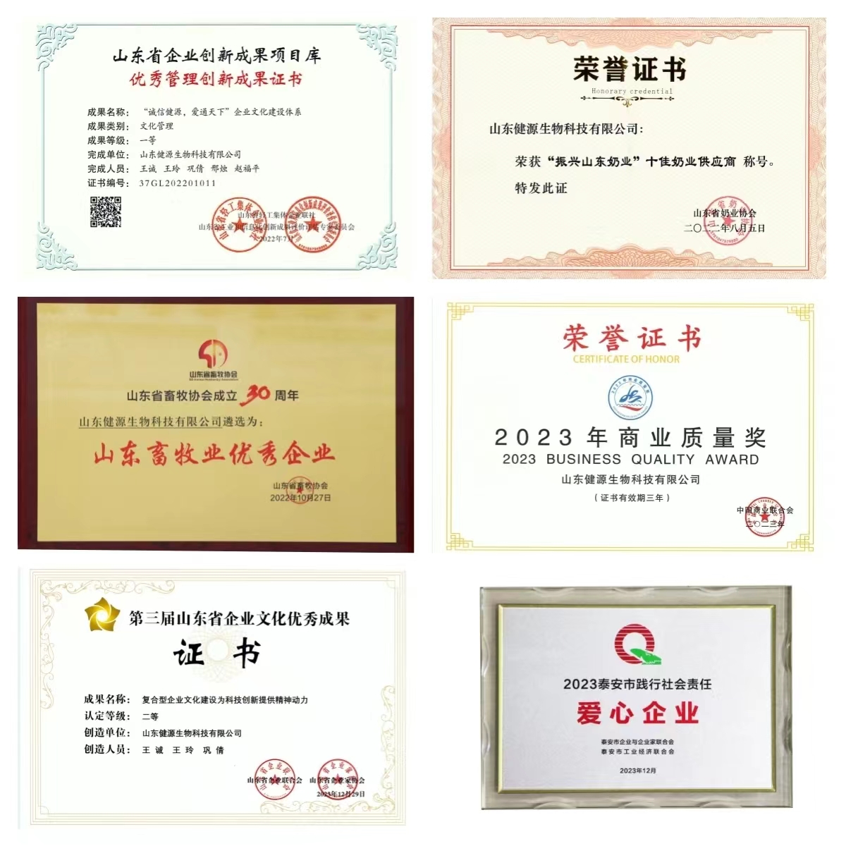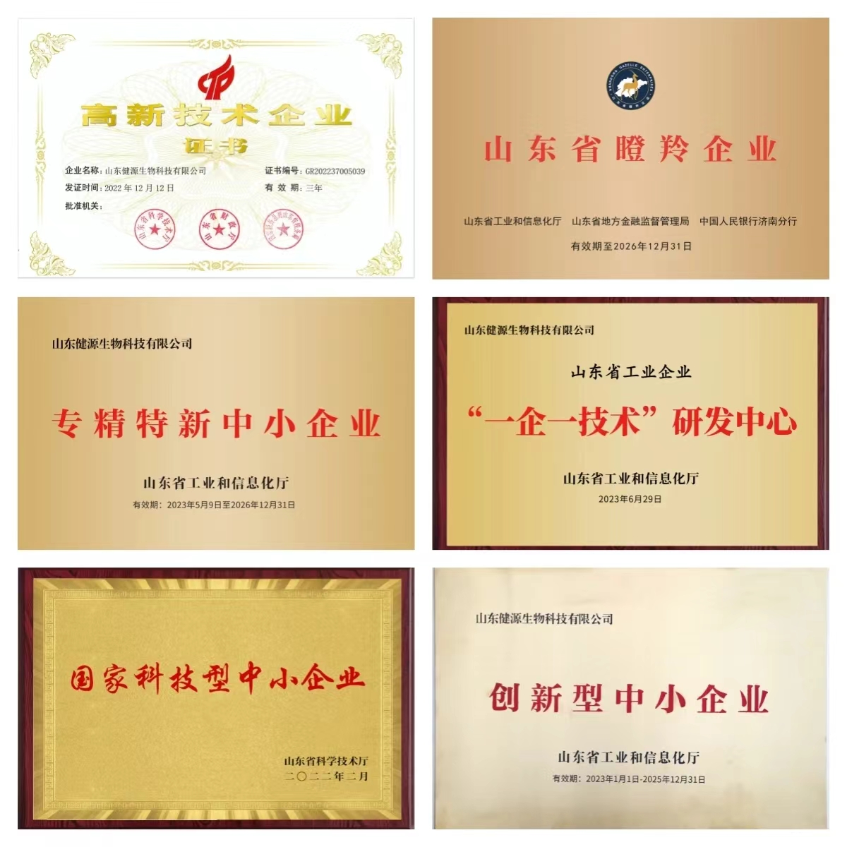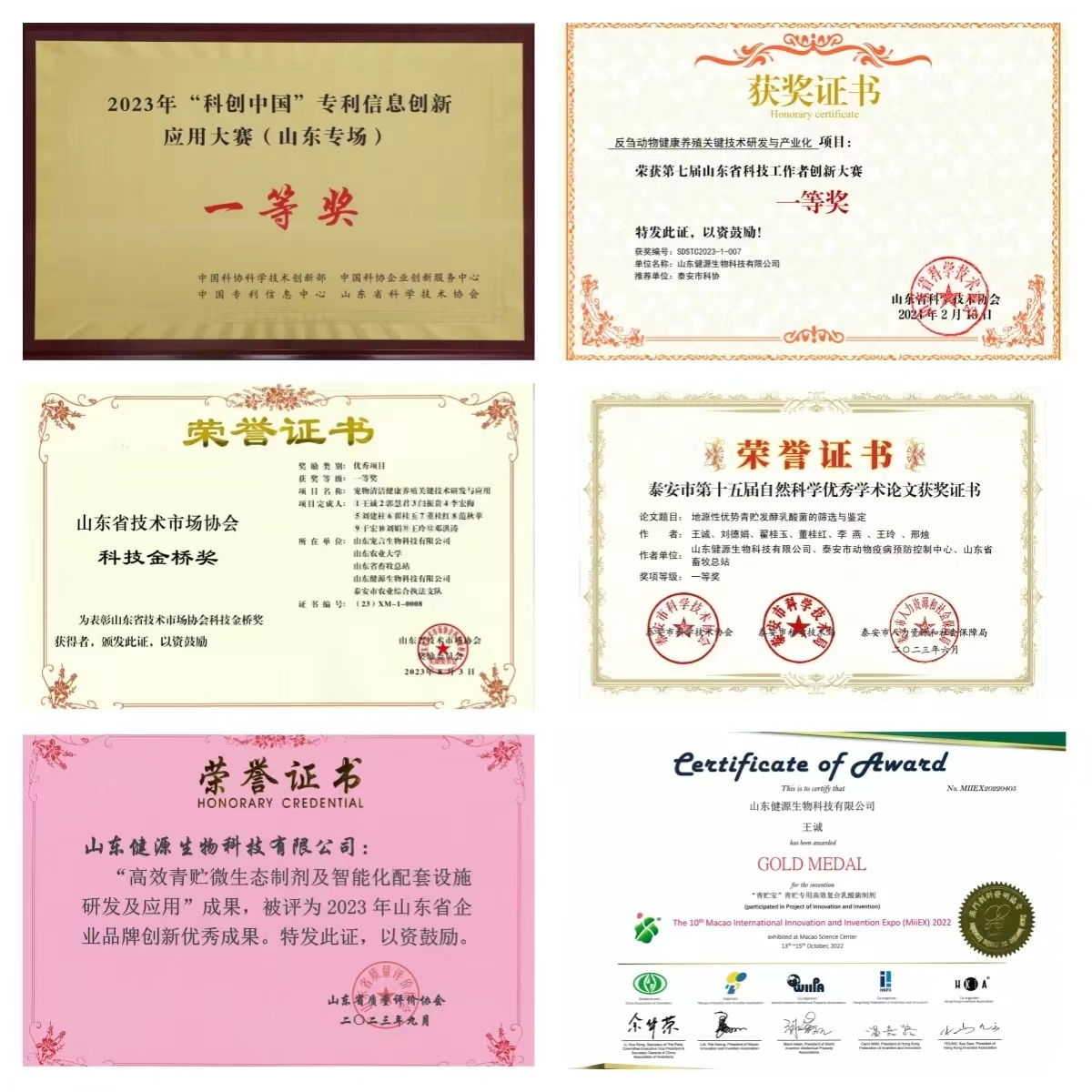 山東健源生物科技有限公司系國家高新技術(shù)企業(yè)、國家科技型中小企業(yè)、山東省瞪羚企業(yè)、山東省專精特新中小企業(yè)、山東省一企一技術(shù)研發(fā)中心、泰安市農(nóng)業(yè)產(chǎn)業(yè)化重點龍頭企業(yè)。公司深耕動物微生態(tài)行業(yè)十年,主攻動物類生物大健康產(chǎn)品,研發(fā)出三十多種高活性生物制劑產(chǎn)品,致力于以高科技生物技術(shù)保障動物健康,現(xiàn)已獲得國家知識產(chǎn)權(quán)局頒發(fā)的各類專利證書100余項,其中包括32項國家發(fā)明專利、3項國際發(fā)明專利,60余項實用新型專利、14項軟件著作權(quán),注冊商標(biāo)100多個,還有正在申請中的國家發(fā)明專利20余項,累計榮獲市級科技獎項7項,省級科技獎項30余項,部級科技獎項12項。