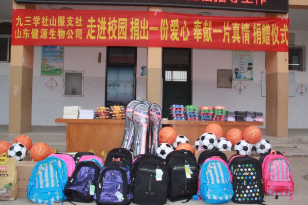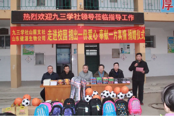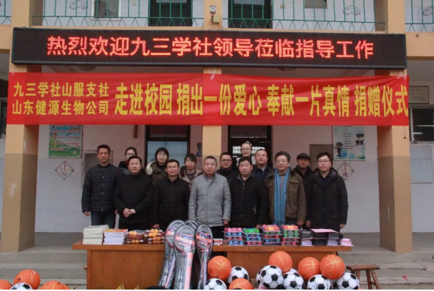 人生之善莫過于助人,助人之德莫過于助學,為積極履行社會責任,關注支持貧困地區(qū)教育事業(yè)發(fā)展,2019年1月11日,九三學社與山東健源生物科技有限公司共同為泰安市高新區(qū)化馬灣鄉(xiāng)當?shù)匾患倚W捐贈了一批體育器材、學習用品及辦公用品,為該校師生送去了社會的關心和溫暖。
