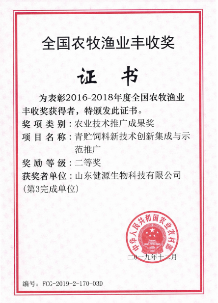 根據(jù)農(nóng)業(yè)部關(guān)于2016-2018年度農(nóng)牧漁業(yè)豐收獎獲獎情況的通報,山東健源生物科技有限公司和山東省畜牧總站聯(lián)合申報的“青貯飼料新技術(shù)創(chuàng)新集成與示范推廣”項目榮獲農(nóng)村農(nóng)業(yè)部頒發(fā)的農(nóng)牧漁業(yè)豐收獎(農(nóng)業(yè)技術(shù)推廣成果獎)二等獎。