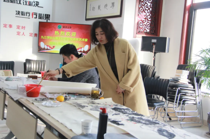 2020年11月6日,九三學(xué)社山東服裝學(xué)院支社侯家華主委攜泰安市青年藝術(shù)家們一行7人專程來(lái)到山東健源生物參觀指導(dǎo)、現(xiàn)場(chǎng)作畫,并傳授書畫藝術(shù)的精髓,弘揚(yáng)傳統(tǒng)文化。