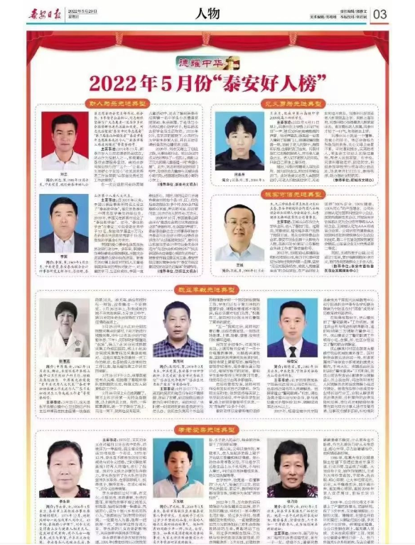 《泰安日報》發(fā)布2022年5月份“泰安好人榜”