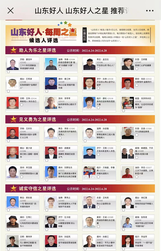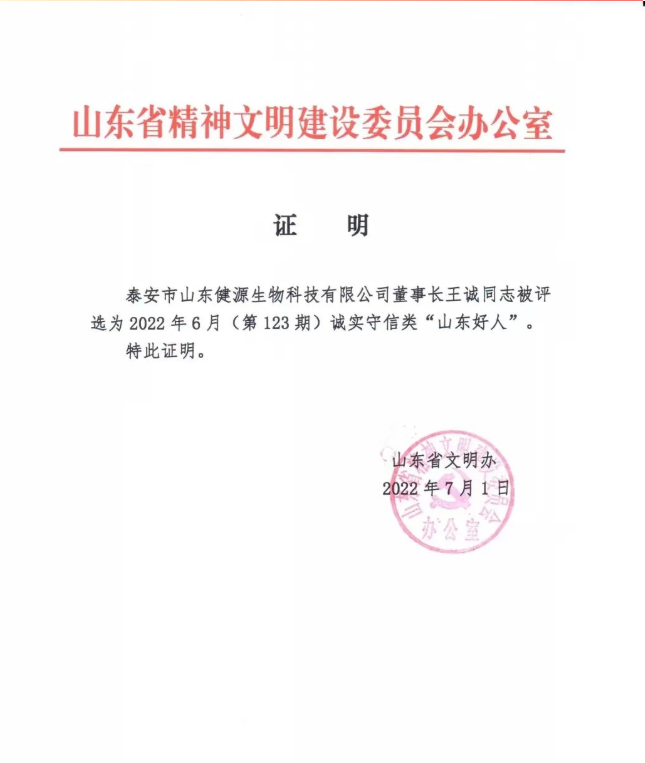 為深入貫徹落實黨的十七屆六中全會精神,推動學雷鋒活動常態(tài)化,推進公民思想道德建設,公民道德素質和社會文明程度,努力建設“美德山東”,根據(jù)省委辦公廳《關于深入開展學雷鋒活動的實施意見》(魯辦發(fā)[2012]6號)精神,在全省廣泛開展“山東好人——每周之星”評選活活動由省委宣傳部、省文明辦、大眾報業(yè)集團、省總工會、團省委、省婦聯(lián)、山東廣播電視臺聯(lián)合主辦。山東健源生物科技有限公司王誠董事長被評選為2022年6月(123期)誠實守信類“山東好人”。