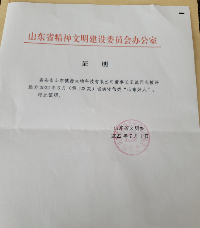 由泰安文明辦主辦、泰安文明網(wǎng)承辦的“我推薦我評議身邊好人”活動中,經(jīng)廣大群眾評議,山東健源生物科技有限公司王誠董事長入選五月“泰安好人榜”,由泰安市精神文明建設委員會頒發(fā)。