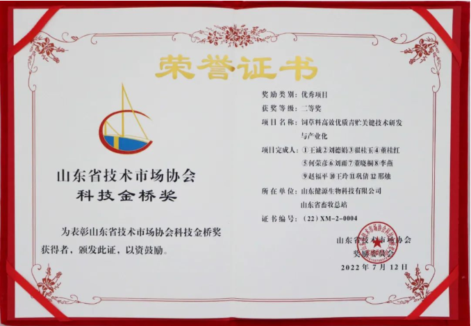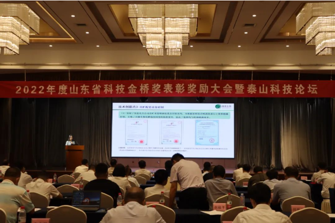 2022年8月11日,2022年度山東省科技金橋獎表彰獎勵大會暨泰山科技論壇在淄博高青舉行。會議現(xiàn)場為項目頒獎,經(jīng)過專業(yè)組評審、評審委員會評審、獎勵委員會終審,決定授予山東健源生物科技有限公司項目為山東省科技金橋獎項目二等獎,山東健源生物王誠董事長作為項目完成人上臺領(lǐng)獎。