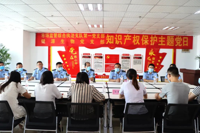 服務(wù)經(jīng)濟(jì)發(fā)展,賦能強(qiáng)市建設(shè)。2022年9月2日,山東健源生物黨支部與泰安市市場監(jiān)管綜合執(zhí)法支隊(duì)黨支部聯(lián)合開展"知識產(chǎn)權(quán)保護(hù)主題黨日"活動(dòng),增強(qiáng)企業(yè)知識產(chǎn)權(quán)保護(hù)意識。泰安市市場監(jiān)管綜合執(zhí)法支隊(duì)副支隊(duì)長孫鳳明、任常平帶領(lǐng)第一支部12名黨員參加,山東健源生物行政副總經(jīng)理王玲、技術(shù)研發(fā)部主任董桂紅等相關(guān)部門負(fù)責(zé)人一同參與活動(dòng)。