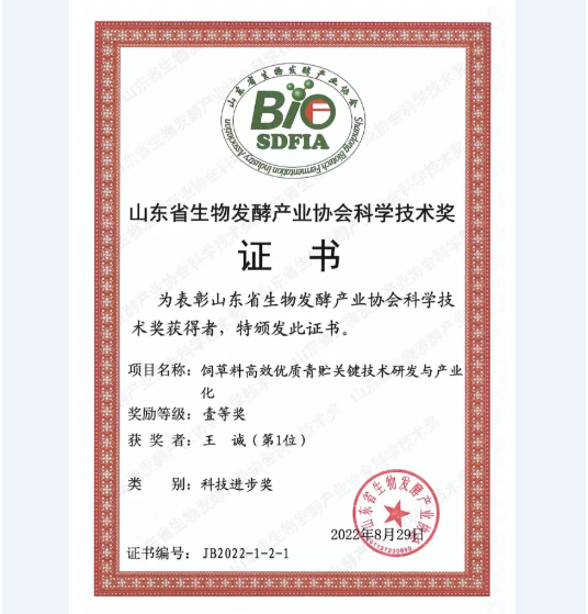 根據(jù)《國(guó)務(wù)院辦公廳關(guān)于完善科技成果評(píng)價(jià)機(jī)制的指導(dǎo)意見(jiàn)》(國(guó)辦發(fā)(2021)26 號(hào))和《山東省科技廳關(guān)于進(jìn)一步鼓勵(lì)和規(guī)范山東省社會(huì)力量獎(jiǎng)設(shè)立科學(xué)技術(shù)獎(jiǎng)的指導(dǎo)意見(jiàn)》(魯科字[2018]129號(hào))精神,按照《山東省生物發(fā)酵產(chǎn)業(yè)協(xié)會(huì)科學(xué)技術(shù)獎(jiǎng)獎(jiǎng)勵(lì)章程》相關(guān)規(guī)定,開展了 2022 年度山東省生物發(fā)酵產(chǎn)業(yè)協(xié)會(huì)科學(xué)技術(shù)獎(jiǎng)的申報(bào)、評(píng)審工作,經(jīng)山東省生物發(fā)酵產(chǎn)業(yè)協(xié)會(huì)科學(xué)技術(shù)獎(jiǎng)勵(lì)委員會(huì)評(píng)審和審核,山東省生物發(fā)酵產(chǎn)業(yè)協(xié)會(huì)批準(zhǔn),授予2項(xiàng)成果為科技進(jìn)步獎(jiǎng)一等獎(jiǎng),4項(xiàng)成果為科技進(jìn)步獎(jiǎng)二等獎(jiǎng),5項(xiàng)成果為科技進(jìn)步獎(jiǎng)三等獎(jiǎng)。山東健源生物科技有限公司《飼草料高效優(yōu)質(zhì)青貯關(guān)鍵技術(shù)研發(fā)與產(chǎn)業(yè)化》項(xiàng)目榮獲山東省生物發(fā)酵產(chǎn)業(yè)協(xié)會(huì)科學(xué)技術(shù)獎(jiǎng)科技進(jìn)步獎(jiǎng)一等獎(jiǎng)。