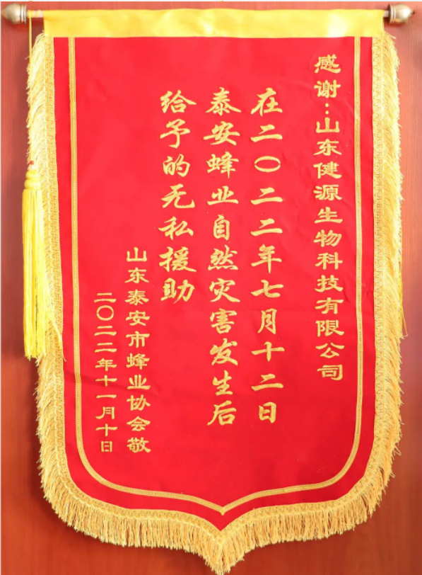 2023年4月11日,山東健源生物科技有限公司收到來自山東泰安市蜂業(yè)協(xié)會的一封感謝信和一面錦旗,感謝山東健源生物在2022年7月12日,泰安蜂業(yè)自然災害發(fā)生后,給予的無私援助。