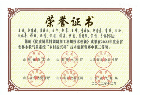 近日,由山東省總工會牽頭,山東省水利廳、山東省農(nóng)業(yè)農(nóng)村廳、山東省自然資源廳、山東省畜牧獸醫(yī)局、山東省氣象局組織的2022 年度全省農(nóng)林水牧氣象系統(tǒng) “鄉(xiāng)村振興杯”和“建設(shè)綠色安瀾黃河” 工作創(chuàng)新技術(shù)創(chuàng)新競賽獲獎成果進行了公布。山東健源生物科技有限公司《優(yōu)質(zhì)飼草料調(diào)制加工利用技術(shù)創(chuàng)新》成果榮獲2022年度全省農(nóng)林水牧氣象系統(tǒng)“鄉(xiāng)村振興杯”技術(shù)創(chuàng)新競賽三等獎。