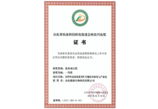 2023年5月27日, 第三屆全省科技興農(nóng)獎(jiǎng)表彰獎(jiǎng)勵(lì)大會(huì)在青島成功舉行,會(huì)上對在2022年度全省農(nóng)業(yè)科技成果轉(zhuǎn)化工作中涌現(xiàn)的先進(jìn)集體、先進(jìn)個(gè)人和優(yōu)秀項(xiàng)目進(jìn)行表彰,山東健源生物科技有限公司《飼草料高效優(yōu)質(zhì)青貯關(guān)鍵技術(shù)研發(fā)與產(chǎn)業(yè)化》項(xiàng)目榮獲山東省農(nóng)業(yè)科技轉(zhuǎn)化促進(jìn)會(huì)科技興農(nóng)獎(jiǎng)優(yōu)秀項(xiàng)目獎(jiǎng)一等獎(jiǎng)。