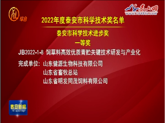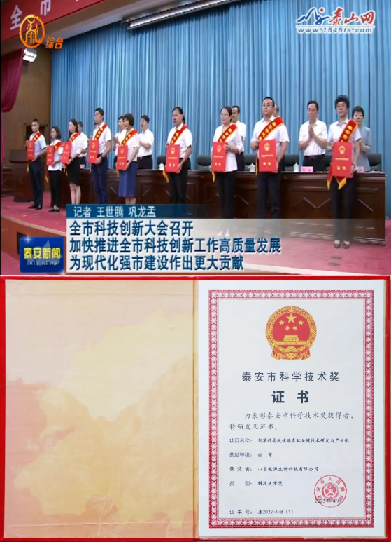 會議宣讀了泰安市人民政府《關(guān)于2022年度科學(xué)技術(shù)獎(jiǎng)勵(lì)的決定》和《關(guān)于下達(dá)2023年泰安市科技創(chuàng)新“雙十工程”項(xiàng)目的通知》,并為2022年度科學(xué)技術(shù)獎(jiǎng)獲獎(jiǎng)代表頒獎(jiǎng)。山東健源生物科技有限公司《飼草料高效優(yōu)質(zhì)青貯關(guān)鍵技術(shù)研發(fā)與產(chǎn)業(yè)化》項(xiàng)目榮獲泰安市科學(xué)技術(shù)進(jìn)步獎(jiǎng)一等獎(jiǎng)。