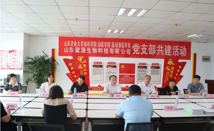 2023年8月26日, 山東農(nóng)業(yè)大學(xué)動(dòng)科學(xué)院(動(dòng)醫(yī)學(xué)院)基礎(chǔ)獸醫(yī)學(xué)系與山東健源生物科技有限公司開(kāi)展黨支部共建活動(dòng),山東農(nóng)業(yè)大學(xué)郭慧君教授、邱建華副教授、侯秋玲教授、肖一紅教授、蔡玉梅教授、王剛教授、王春陽(yáng)副教授,山東健源生物科技有限公司董事長(zhǎng)王誠(chéng)以及研發(fā)部相關(guān)負(fù)責(zé)人參加此次黨建共建活動(dòng)。