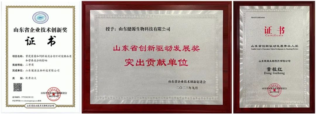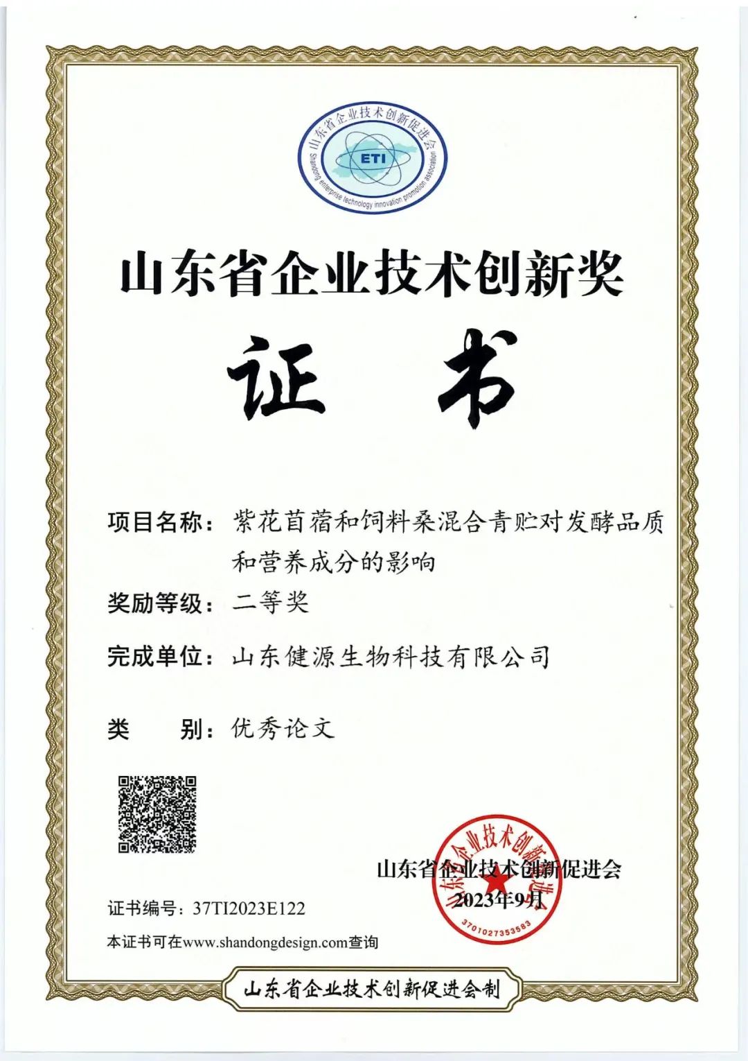 為深入貫徹落實創(chuàng)新驅動發(fā)展戰(zhàn)略,強化企業(yè)技術創(chuàng)新主體地位,全面提升企業(yè)創(chuàng)新能力,選樹一批示范帶頭企業(yè)、優(yōu)秀工作者及創(chuàng)新成果,鼓勵我省企業(yè)和廣大技術創(chuàng)新工作者不斷做出新的貢獻。根據(jù)《山東省科學技術廳關于進一步鼓勵和規(guī)范山東省社會力量設立科學技術獎的指導意見》《山東省企業(yè)技術創(chuàng)新促進會章程》和《山東省企業(yè)技術創(chuàng)新促進會技術創(chuàng)新獎獎勵辦法》有關要求,結合工作實際,組織開展2023年山東省企業(yè)技術創(chuàng)新促進會技術創(chuàng)新獎評選工作。根據(jù)《山東省企業(yè)技術創(chuàng)新促進會技術創(chuàng)新獎獎勵辦法》和有關評審細則,評選活動結果公示。山東健源生物科技有限公司榮獲山東省創(chuàng)新驅動發(fā)展獎突出貢獻單位。公司論文《紫花苜蓿和飼料桑混合青貯對發(fā)酵品質和營養(yǎng)成分的影響》榮獲山東省企業(yè)技術創(chuàng)新獎優(yōu)秀論文二等獎。公司研發(fā)部負責人董桂紅榮獲山東省創(chuàng)新驅動發(fā)展帶頭人獎。