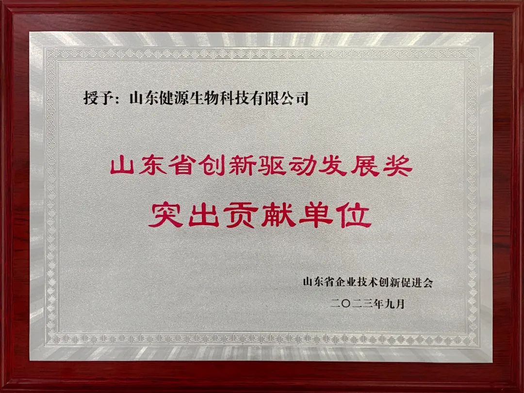 山東健源生物科技有限公司榮獲山東省創(chuàng)新驅動發(fā)展獎突出貢獻單位