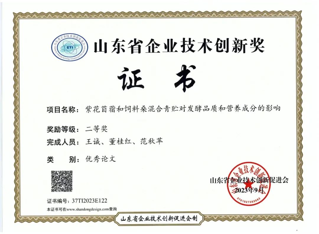 《紫花苜蓿和飼料;旌锨噘A對發(fā)酵品質和營養(yǎng)成分的影響》榮獲山東省企業(yè)技術創(chuàng)新獎優(yōu)秀論文二等獎