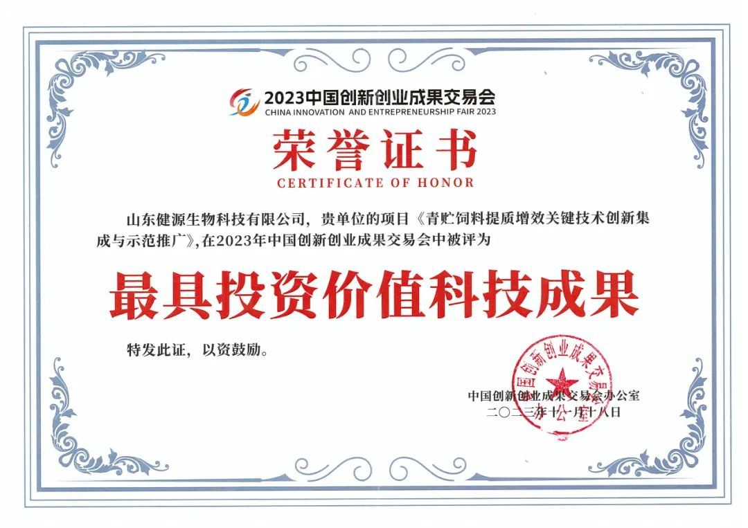 山東健源生物科技有限公司的《青貯飼料提質(zhì)增效關(guān)鍵技術(shù)創(chuàng)新集成與示范推廣》項目在2023年中國創(chuàng)新創(chuàng)業(yè)成果交易會中被評為最具投資價值科技成果,該獎項的獲得充分肯定了健源生物在技術(shù)創(chuàng)新方面的卓越表現(xiàn)以及公司科技成果在市場應(yīng)用方面的優(yōu)秀潛力。