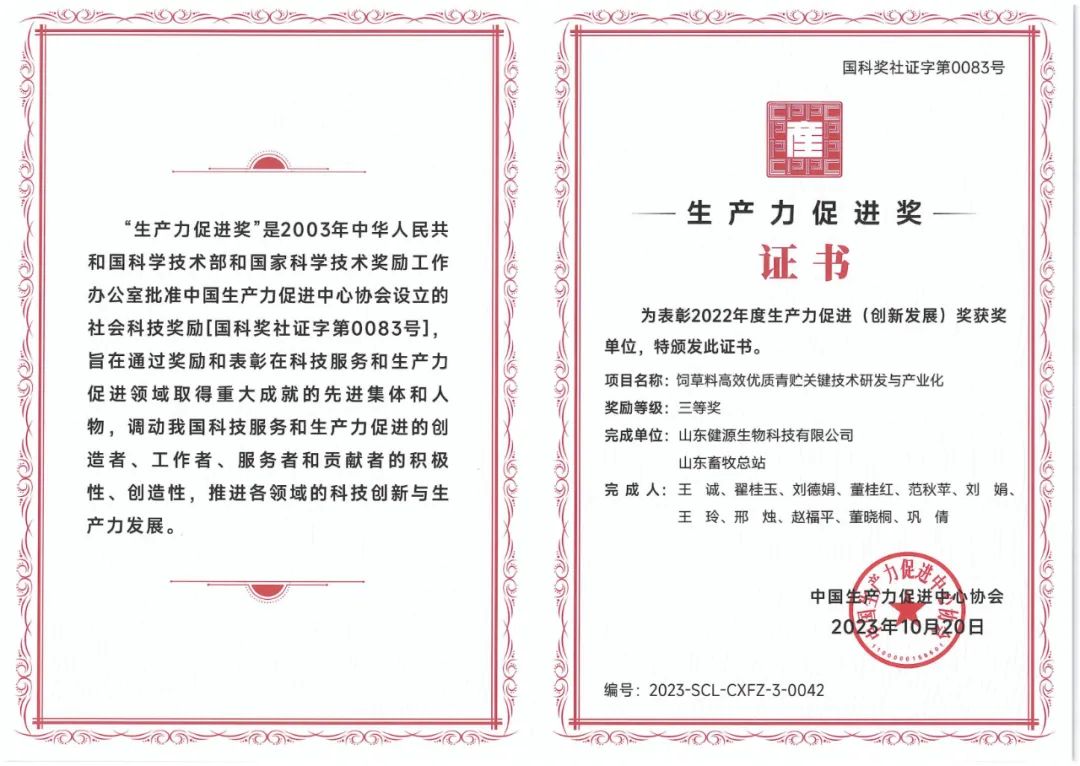 12月9日,2023中國(guó)生產(chǎn)力促進(jìn)中心協(xié)會(huì)年會(huì)暨第十六屆寰宇生產(chǎn)力論壇生產(chǎn)力創(chuàng)新發(fā)展大會(huì)在北京成功召開,山東健源生物科技有限公司“飼草料高效優(yōu)質(zhì)青貯關(guān)鍵技術(shù)研發(fā)與產(chǎn)業(yè)化”項(xiàng)目榮獲2022年度生產(chǎn)力促進(jìn)(創(chuàng)新發(fā)展)獎(jiǎng)三等獎(jiǎng)。