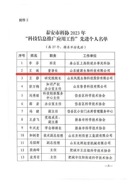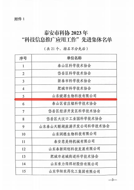 2023年12月28日,泰安市科學(xué)技術(shù)協(xié)會(huì)印發(fā)《關(guān)于表?yè)P(yáng)2023年“科技信息推廣應(yīng)用工作”先進(jìn)集體和先進(jìn)個(gè)人的通報(bào)》,山東健源生物科技有限公司董事長(zhǎng)王誠(chéng)被評(píng)為泰安市科協(xié)2023年“科技信息推廣應(yīng)用工作”先進(jìn)個(gè)人,山東健源生物科技有限公司被評(píng)為泰安市科協(xié)2023年“科技信息推廣應(yīng)用工作”先進(jìn)集體,旗下子公司寵言生物技術(shù)中心主任范秋萍被評(píng)為泰安市科協(xié)2023年“科技信息推廣應(yīng)用工作”先進(jìn)個(gè)人。