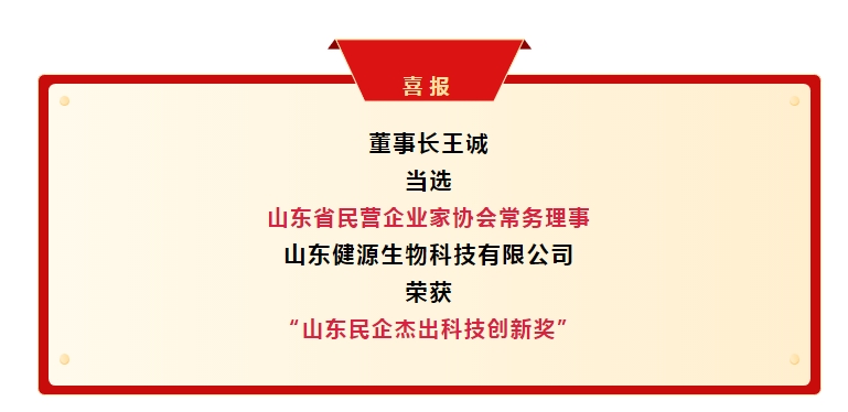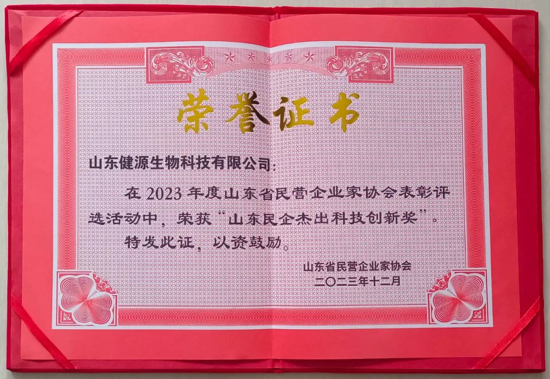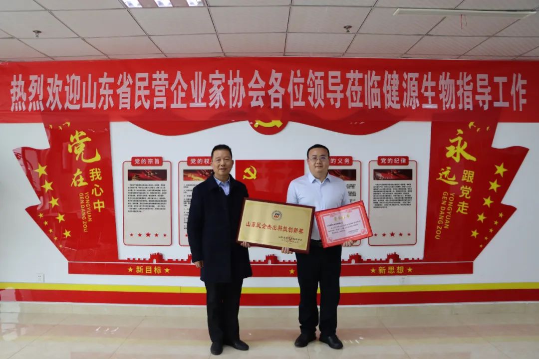 在科技創(chuàng)新的征途上,健源生物再創(chuàng)佳績(jī),榮獲山東省民營(yíng)企業(yè)家協(xié)會(huì)“山東民企杰出科技創(chuàng)新獎(jiǎng)”。