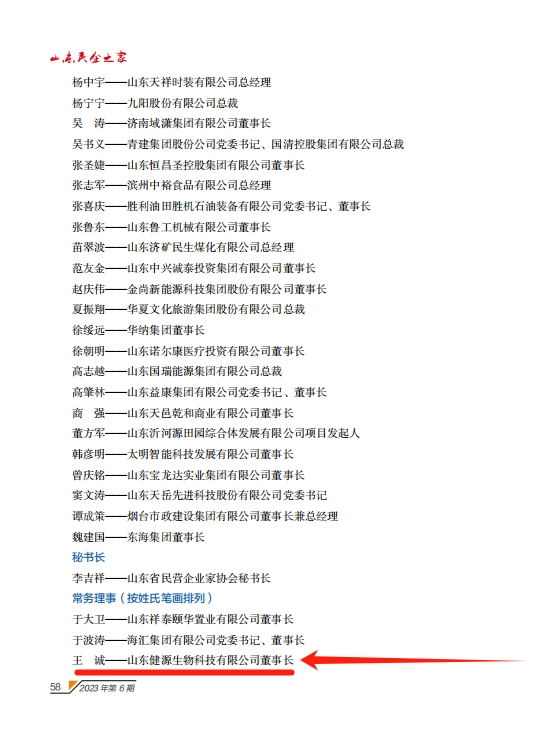 近日,在2023年度山東省民營(yíng)企業(yè)家協(xié)會(huì)表彰評(píng)選活動(dòng)中,經(jīng)山東省民營(yíng)企業(yè)家協(xié)會(huì)三屆十六次會(huì)長(zhǎng)會(huì)議研究,報(bào)請(qǐng)協(xié)會(huì)三屆五次會(huì)員代表大會(huì)審議,決定增補(bǔ)山東健源生物科技有限公司董事長(zhǎng)王誠(chéng)為山東省民營(yíng)企業(yè)家協(xié)會(huì)第三屆理事會(huì)常務(wù)理事。