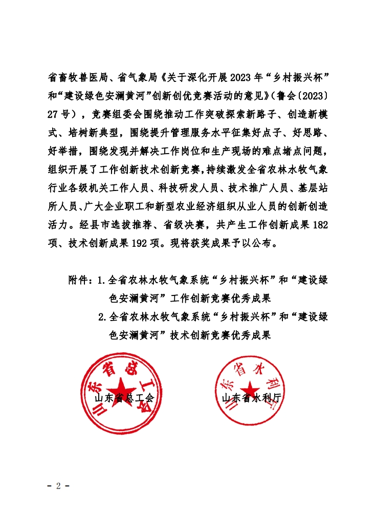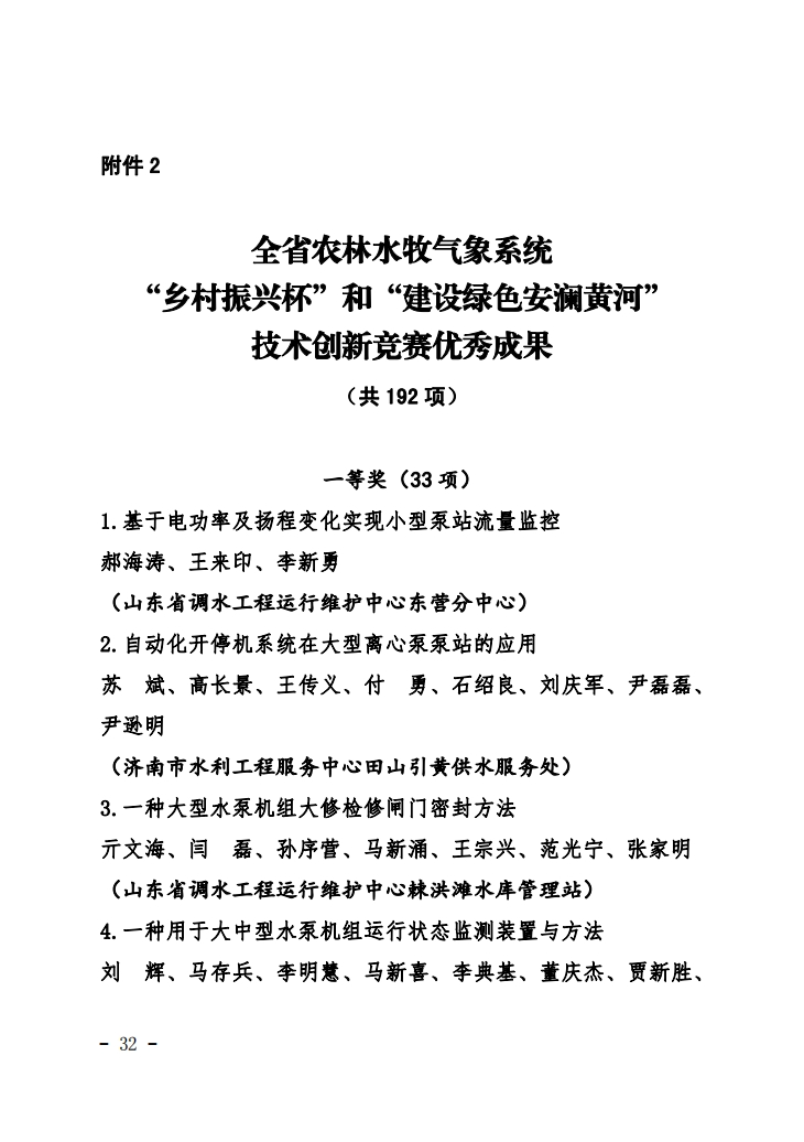 本次競(jìng)賽活動(dòng)是根據(jù)《關(guān)于深化開展2023年“鄉(xiāng)村振興杯”和“建設(shè)綠色安瀾黃河”創(chuàng)新創(chuàng)優(yōu)競(jìng)賽活動(dòng)的意見》(魯會(huì)【2023】27號(hào)),競(jìng)賽組委會(huì)圍繞推動(dòng)工作突破探索新路子、創(chuàng)造新模式、培樹新典型,圍繞提升管理服務(wù)水平征集好點(diǎn)子、好思路、好舉措,圍繞發(fā)現(xiàn)并解決工作崗位和生產(chǎn)現(xiàn)場(chǎng)的難點(diǎn)堵點(diǎn)問題,組織開展了工作創(chuàng)新技術(shù)創(chuàng)新競(jìng)賽,經(jīng)縣市選拔推薦、省級(jí)決賽,競(jìng)賽組委會(huì)嚴(yán)格規(guī)范評(píng)選,共產(chǎn)生技術(shù)創(chuàng)新成果192項(xiàng),其中,一等獎(jiǎng)33項(xiàng)。