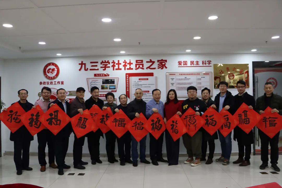 九三學(xué)社新社員、省書協(xié)會員李澤覃現(xiàn)場揮毫潑墨,福送社友,祝福大家萬事如意、幸福安康!全體參會人員手持福字合影,共同展望幸福美好的新一年,祝愿偉大祖國繁榮昌盛,福滿人間!