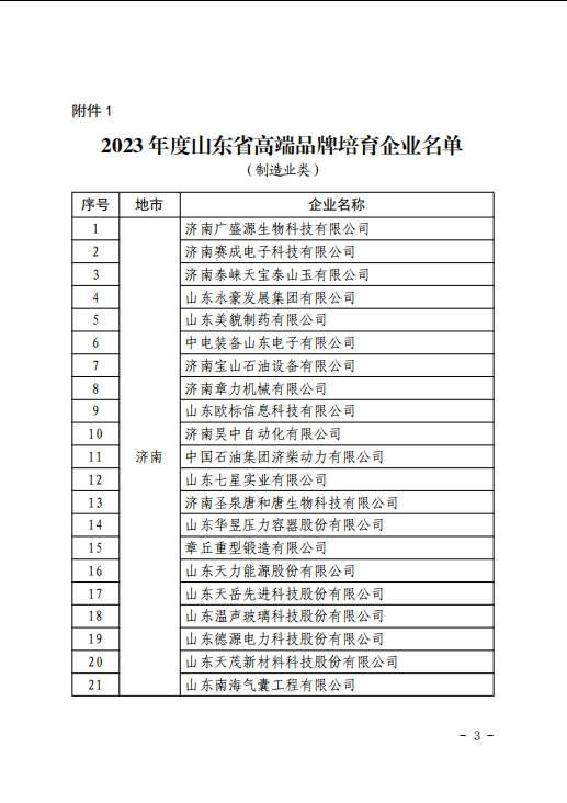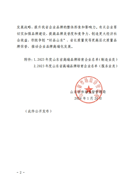 發(fā)布時間:[2024-2-4 8:44:32] 瀏覽量:3632次山東省市場監(jiān)督管理局主持開展的山東省高端品牌培育企業(yè)評選工作是培育質(zhì)量高、效益高、誠信度高、美譽(yù)度高的山東企業(yè)品牌,是深入實(shí)施質(zhì)量強(qiáng)省及品牌戰(zhàn)略,共建共享“好品山東”,加快推進(jìn)山東省品牌高端化進(jìn)程的一項(xiàng)重要工作。經(jīng)組織申報、資格審查、專家評審、綜合評價、結(jié)果審定等環(huán)節(jié),共有360家企業(yè)(含制造業(yè)300家、服務(wù)業(yè)60家)入選2023年度山東省高端品牌培育企業(yè)。