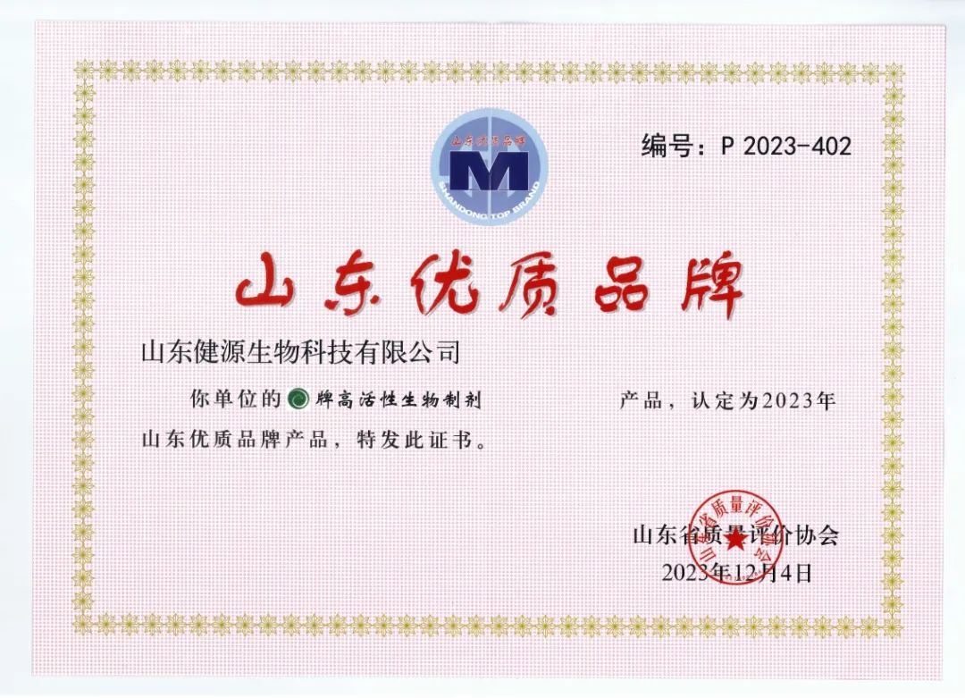 2023年12月,健源高活性生物制劑被山東省質(zhì)量評價協(xié)會認(rèn)定為2023年山東優(yōu)質(zhì)品牌產(chǎn)品。