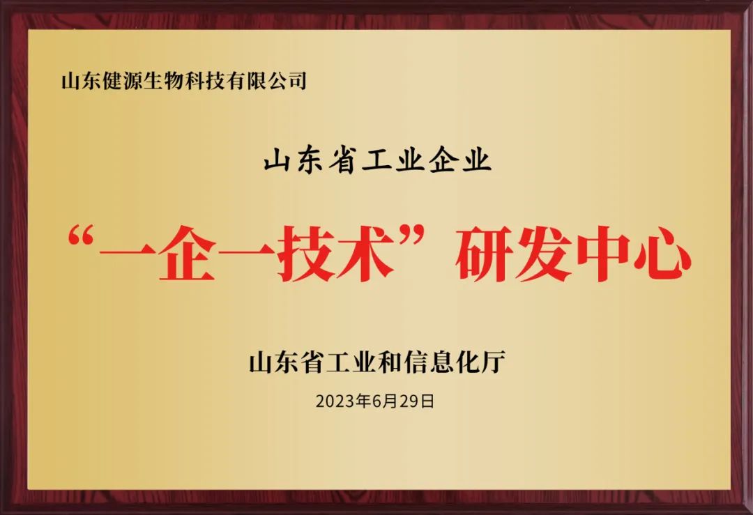 2023年6月,健源生物被山東省工信廳認(rèn)定為2023年山東省工業(yè)企業(yè)“一企一技術(shù)”研發(fā)中心。