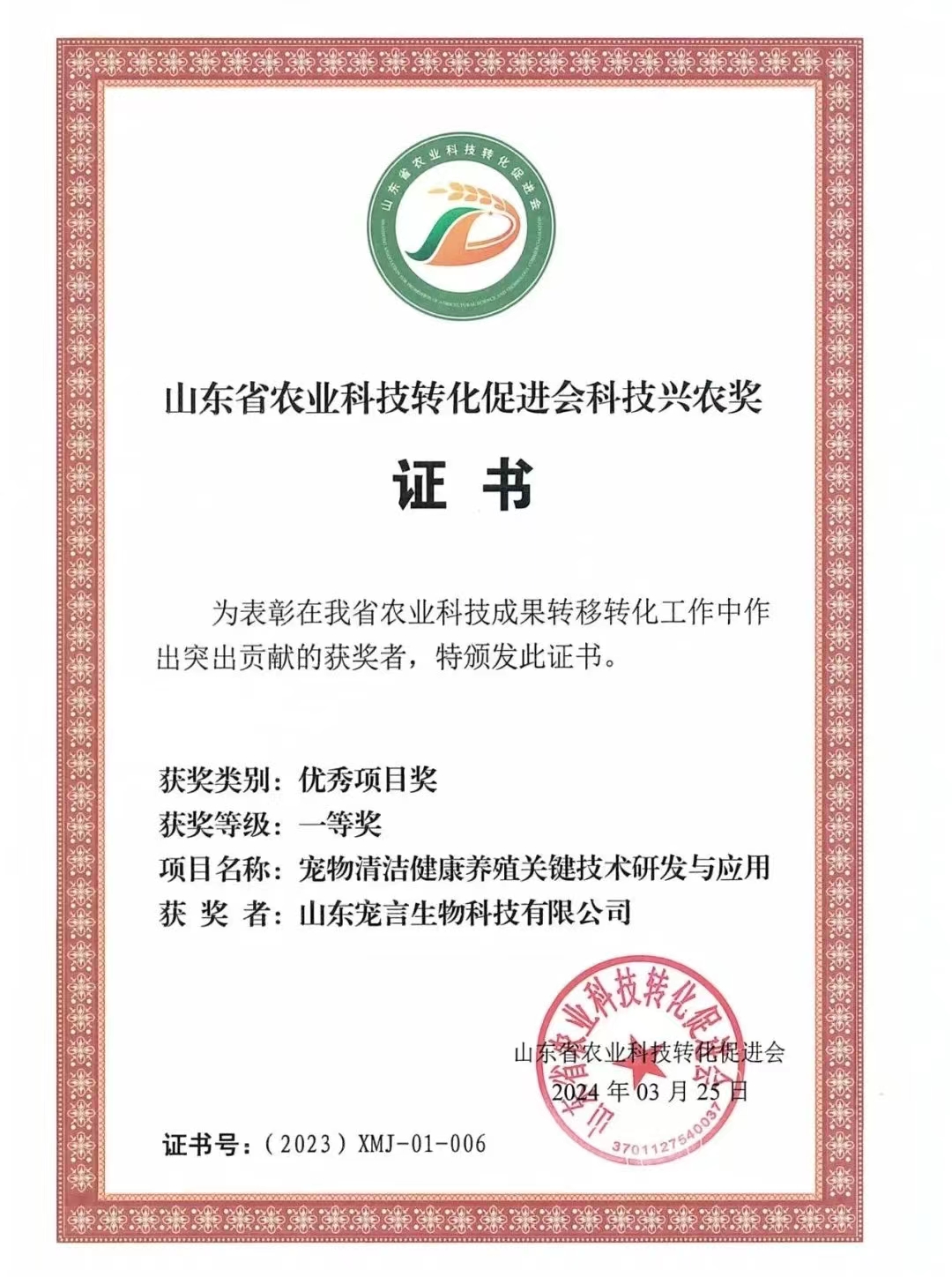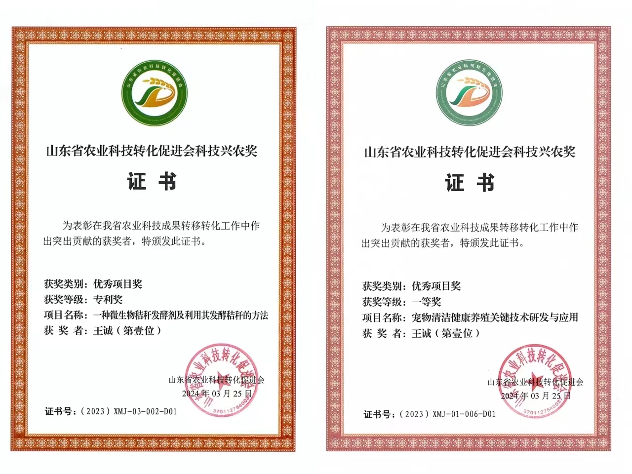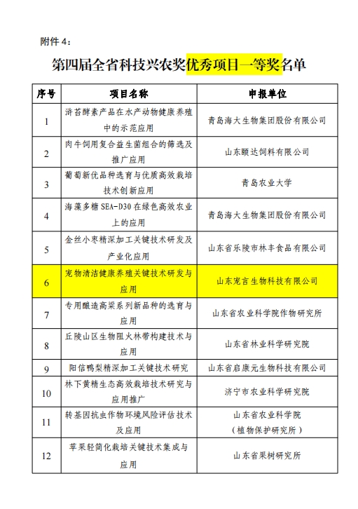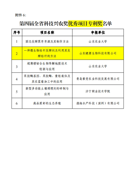 山東健源生物科技有限公司申報(bào)的《一種微生物秸稈發(fā)酵劑及其發(fā)酵秸稈的方法》項(xiàng)目獲得山東省農(nóng)業(yè)科技轉(zhuǎn)化促進(jìn)會(huì)科技興農(nóng)獎(jiǎng)優(yōu)秀項(xiàng)目獎(jiǎng)專利獎(jiǎng)。健源生物旗下子公司山東寵言生物科技有限公司申報(bào)的《寵物清潔健康養(yǎng)殖關(guān)鍵技術(shù)研發(fā)與應(yīng)用》項(xiàng)目獲得山東省農(nóng)業(yè)科技促進(jìn)會(huì)科技興農(nóng)獎(jiǎng)優(yōu)秀項(xiàng)目獎(jiǎng)一等獎(jiǎng),董事長王誠為兩個(gè)項(xiàng)目的第一完成人。