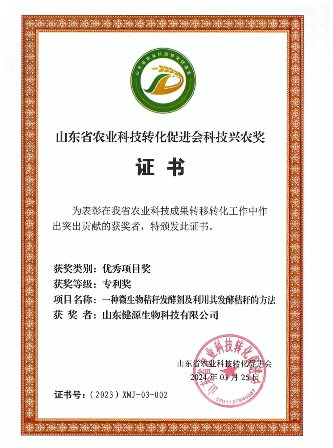 發(fā)布時(shí)間:[2024-4-28 16:49:12] 瀏覽量:3204次為貫徹落實(shí)習(xí)近平總書記在中央農(nóng)村工作會(huì)議講話精神,促進(jìn)農(nóng)業(yè)科技成果轉(zhuǎn)移轉(zhuǎn)化,加快產(chǎn)學(xué)研融合催發(fā)新質(zhì)生產(chǎn)力,實(shí)現(xiàn)全省農(nóng)業(yè)轉(zhuǎn)型升級(jí)和高質(zhì)量發(fā)展,2024年4月27日山東省農(nóng)業(yè)科技轉(zhuǎn)化促進(jìn)會(huì)于山東省農(nóng)科院召開第四屆全省科技興農(nóng)獎(jiǎng)表彰大會(huì)暨高新技術(shù)成果路演發(fā)布科企對接會(huì),山東健源生物科技有限公司作為獲獎(jiǎng)單位受邀參加本次會(huì)議。