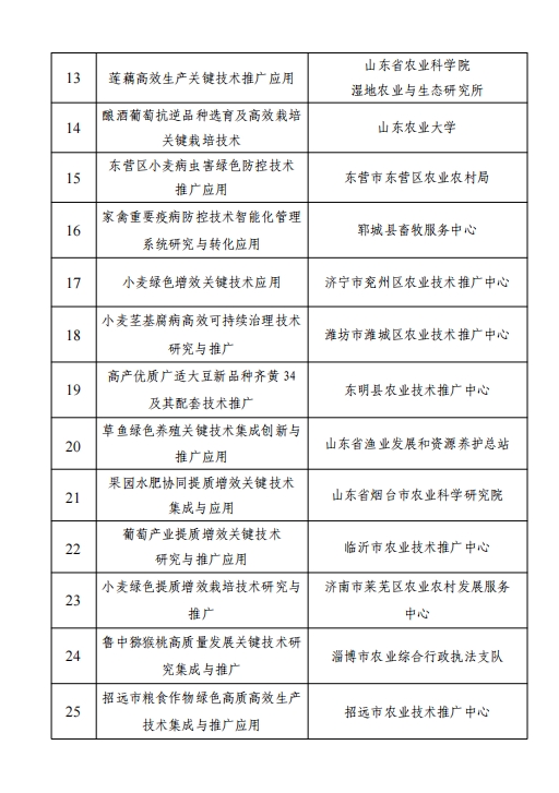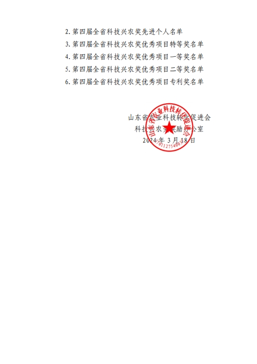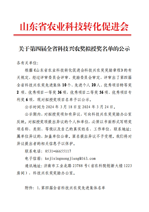 根據(jù)《山東省農(nóng)業(yè)科技轉(zhuǎn)化促進(jìn)會(huì)科技興農(nóng)獎(jiǎng)獎(jiǎng)勵(lì)章程》的有關(guān)規(guī)定,經(jīng)過評審委員會(huì)評審、獎(jiǎng)勵(lì)委員會(huì)審定,評審出了第四屆全省科技興農(nóng)獎(jiǎng)先進(jìn)集體10個(gè)、先進(jìn)個(gè)人20人、優(yōu)秀項(xiàng)目特等獎(jiǎng)2項(xiàng)、優(yōu)秀項(xiàng)目一等獎(jiǎng)36項(xiàng),優(yōu)秀項(xiàng)目二等獎(jiǎng)56項(xiàng)、優(yōu)秀項(xiàng)目專利獎(jiǎng)6項(xiàng)。