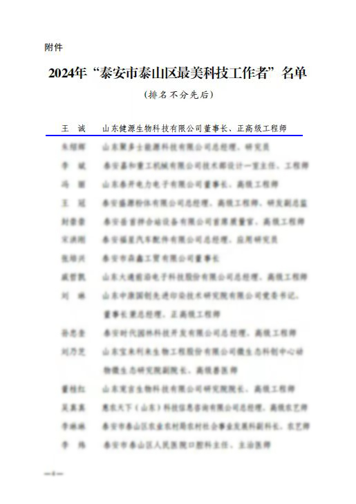 4月18日,泰安市泰山區(qū)區(qū)委宣傳部、區(qū)科協(xié)、區(qū)教體局、區(qū)科技局、區(qū)工信局、區(qū)農業(yè)農村局、區(qū)衛(wèi)健局聯(lián)合下發(fā)《關于公布2024年“泰安市泰山區(qū)最美科技工作者”的通知》,山東健源生物科技有限公司董事長王誠榮獲2024年“泰安市泰山區(qū)最美科技工作者”榮譽稱號。