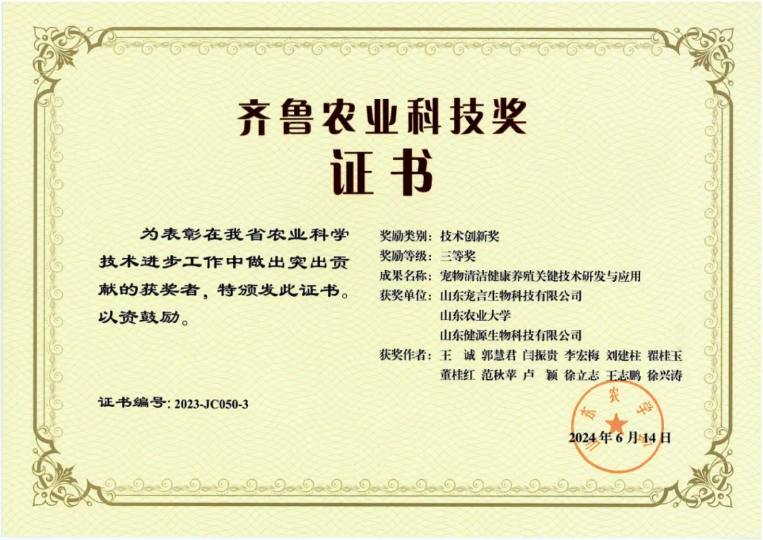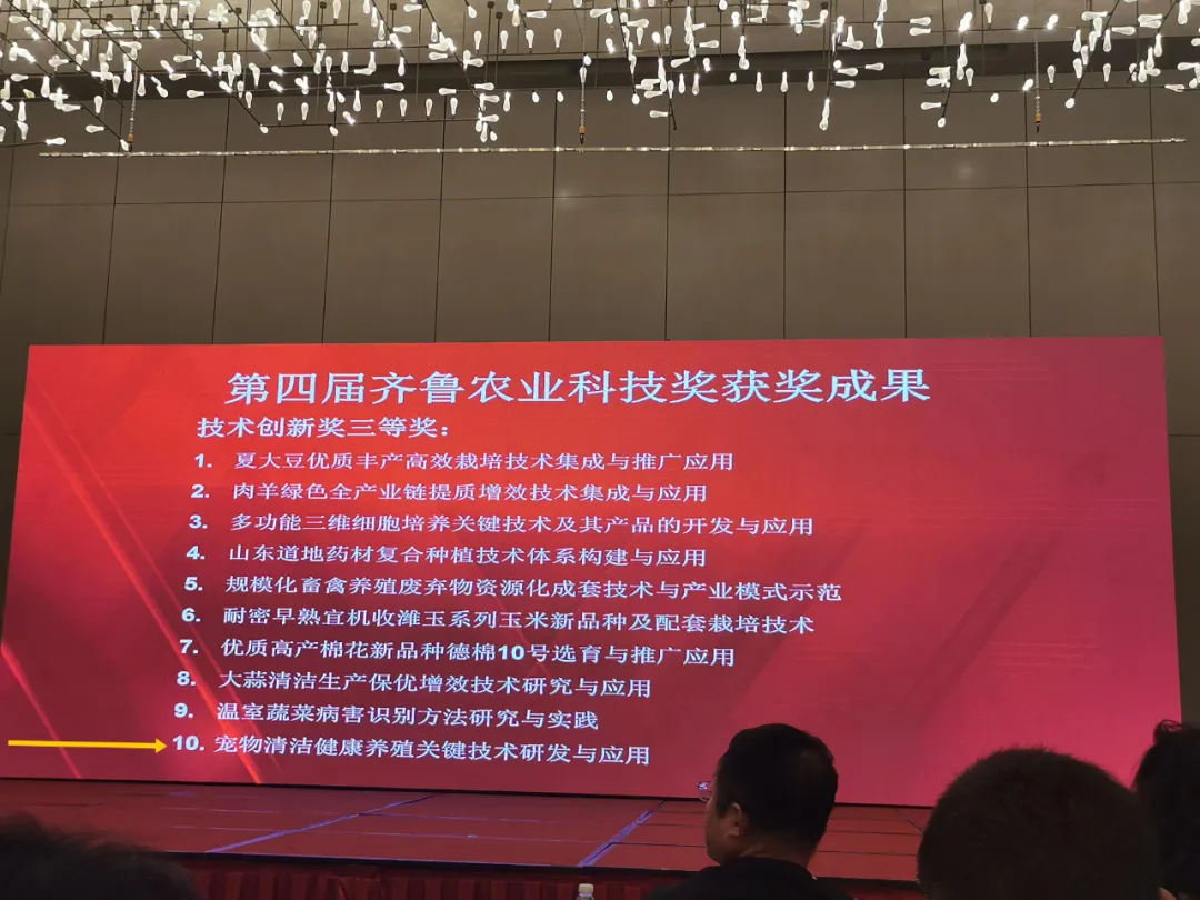8月30日,第四屆齊魯農(nóng)業(yè)科技獎獎勵大會暨第二屆青年學(xué)術(shù)論壇在濟(jì)南召開,評選出77項2023年度齊魯農(nóng)業(yè)科技獎。山東健源生物科技有限公司與子公司山東寵言生物科技有限公司共同完成的“寵物清潔健康養(yǎng)殖關(guān)鍵技術(shù)研發(fā)與應(yīng)用”項目榮獲2023年度齊魯農(nóng)業(yè)科技獎技術(shù)創(chuàng)新獎三等獎。