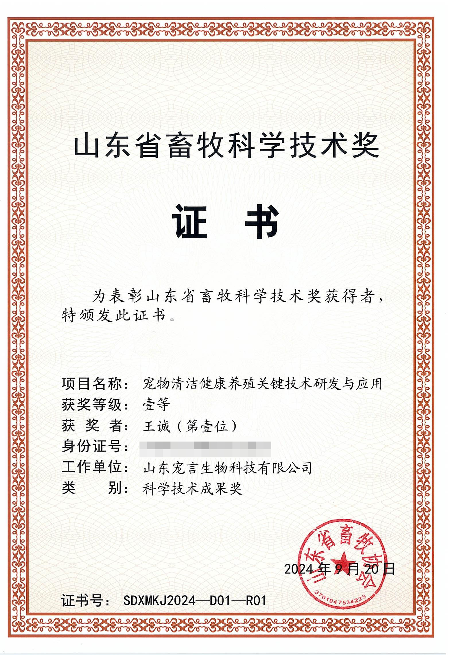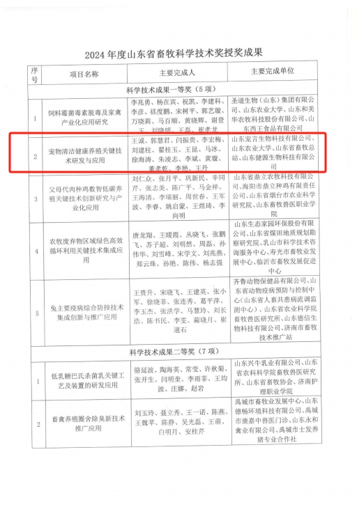 近日,山東省畜牧協(xié)會(huì)公布了2024年山東省畜牧科學(xué)技術(shù)獎(jiǎng)獲獎(jiǎng)名單。山東健源生物科技有限公司與子公司山東寵言生物科技有限公司共同完成的“寵物清潔健康養(yǎng)殖關(guān)鍵技術(shù)研發(fā)與應(yīng)用”項(xiàng)目,憑借其創(chuàng)新性與實(shí)用性,榮獲山東省畜牧科學(xué)技術(shù)獎(jiǎng)科學(xué)技術(shù)成果獎(jiǎng)一等獎(jiǎng)。