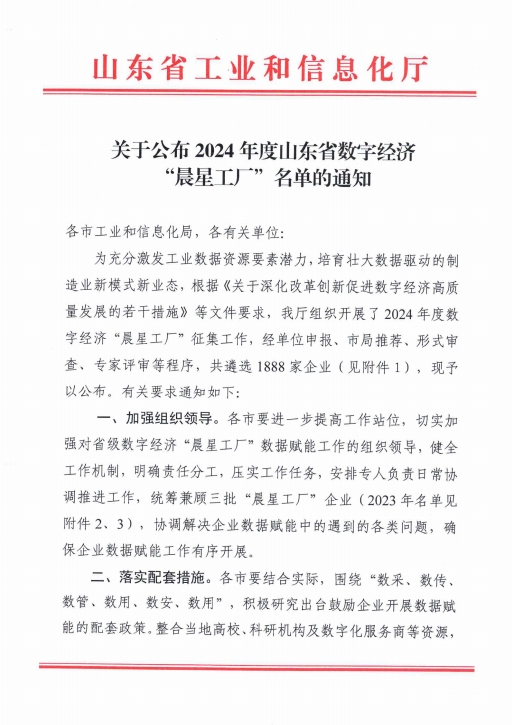 數(shù)字經(jīng)濟“晨星工廠”是山東省為推動數(shù)字經(jīng)濟發(fā)展而設立的重要榮譽,旨在表彰那些創(chuàng)新能力突出、典型示范性強、應用成效明顯、經(jīng)濟效益顯著的數(shù)字驅(qū)動型數(shù)字經(jīng)濟企業(yè),以加快推動山東省工業(yè)企業(yè)在更廣范圍、更深層級開展數(shù)據(jù)采集、傳輸、存算、管理及應用工作,破除企業(yè)“數(shù)據(jù)孤島”,以工業(yè)大數(shù)據(jù)驅(qū)動制造業(yè)資源優(yōu)化配置,促進數(shù)字技術與實體經(jīng)濟深度融合。