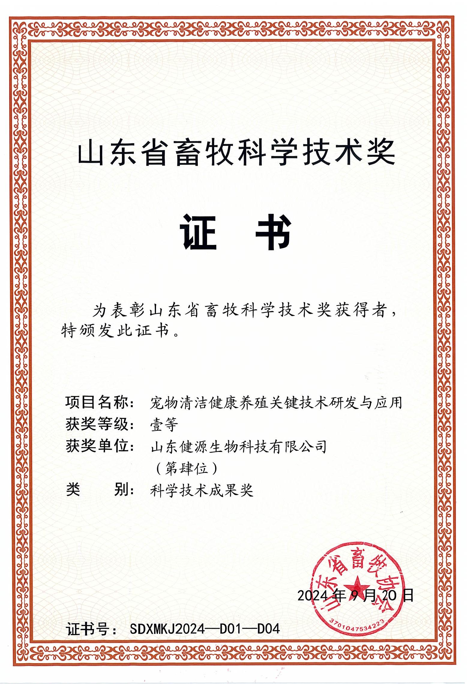 健源生物榮獲山東省畜牧科學(xué)技術(shù)獎(jiǎng)科學(xué)技術(shù)成果獎(jiǎng)一等獎(jiǎng)