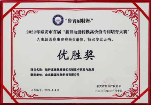 2023-4-4 祝賀山東健源生物榮獲2022年泰安市首屆“新舊動(dòng)能轉(zhuǎn)換高價(jià)值專利培育大賽”優(yōu)勝獎(jiǎng)