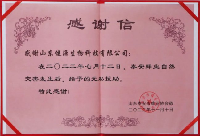 2023年4月11日,山東健源生物科技有限公司收到來自山東泰安市蜂業(yè)協(xié)會(huì)的一封感謝信和一面錦旗,...
