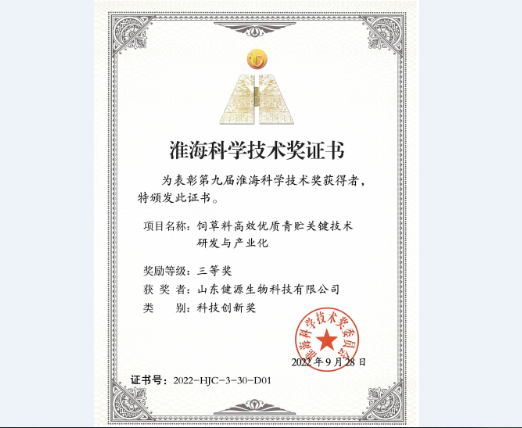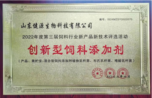 2022-11-1 祝賀山東健源生物(青貯寶)產(chǎn)品榮獲“2022年度創(chuàng)新型飼料添加劑”榮譽(yù)稱號(hào)