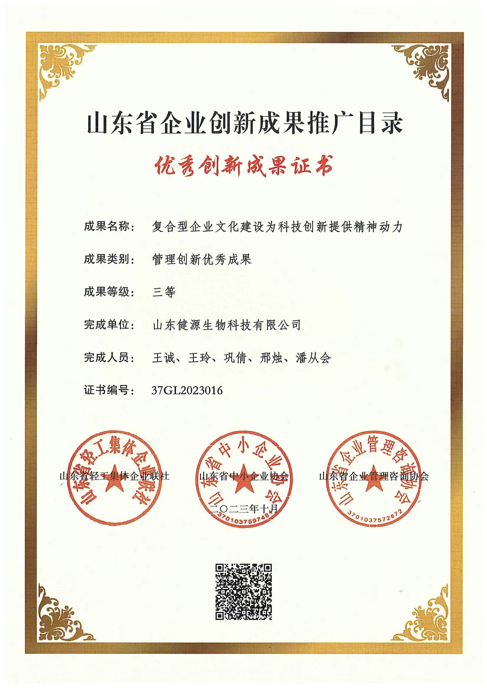2023-12-1 健源生物榮獲管理創(chuàng)新優(yōu)秀成果證書(shū)并入選山東省企業(yè)創(chuàng)新成果推廣目錄