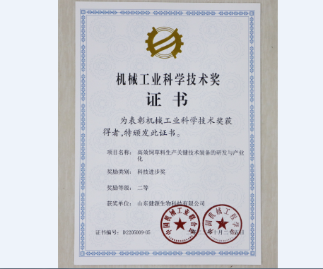 祝賀山東健源生物參與完成的《高效飼草料生產(chǎn)關(guān)鍵技術(shù)裝備的研發(fā)與產(chǎn)業(yè)化》項目榮獲2022年度機械工業(yè)科學技術(shù)獎科技進步獎二等獎